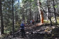 We hiked toward the crest on the Fourth of July Trail and then on the Crest Trail until we were at the base of Mosca Peak. This part of the hike is fairly strenuous, as it is up hill all the way. From an overlook near the trail we could see the Rio Grande valley. We took a break and had lunch near Mosca Peak.