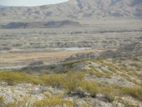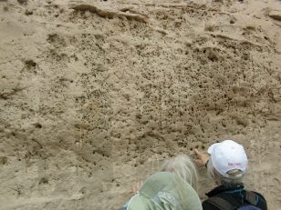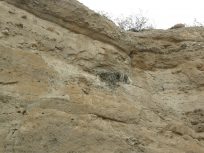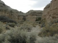 We hiked the 2.2 mile Canyon National Recreation Trail which starts in Solitude Canyon and climbs to a mesa top with an excellent refuge-encompassed vista. There is a guide at the trailhead that corresponds to 24 numbered posts along the way. It describes arroyos, Four-wing Saltbush, “Game trails”, etc and of special interest to us, a canyon wall of holes made by mining bees, Macrotera opuntiae. The tunnels go about 4″ into the rock and several entrances can connect into a network of tunnels with larger chambers, visible when the wall sloughs away. The bees are believed to gather pollen exclusively from prickly pear blossoms.