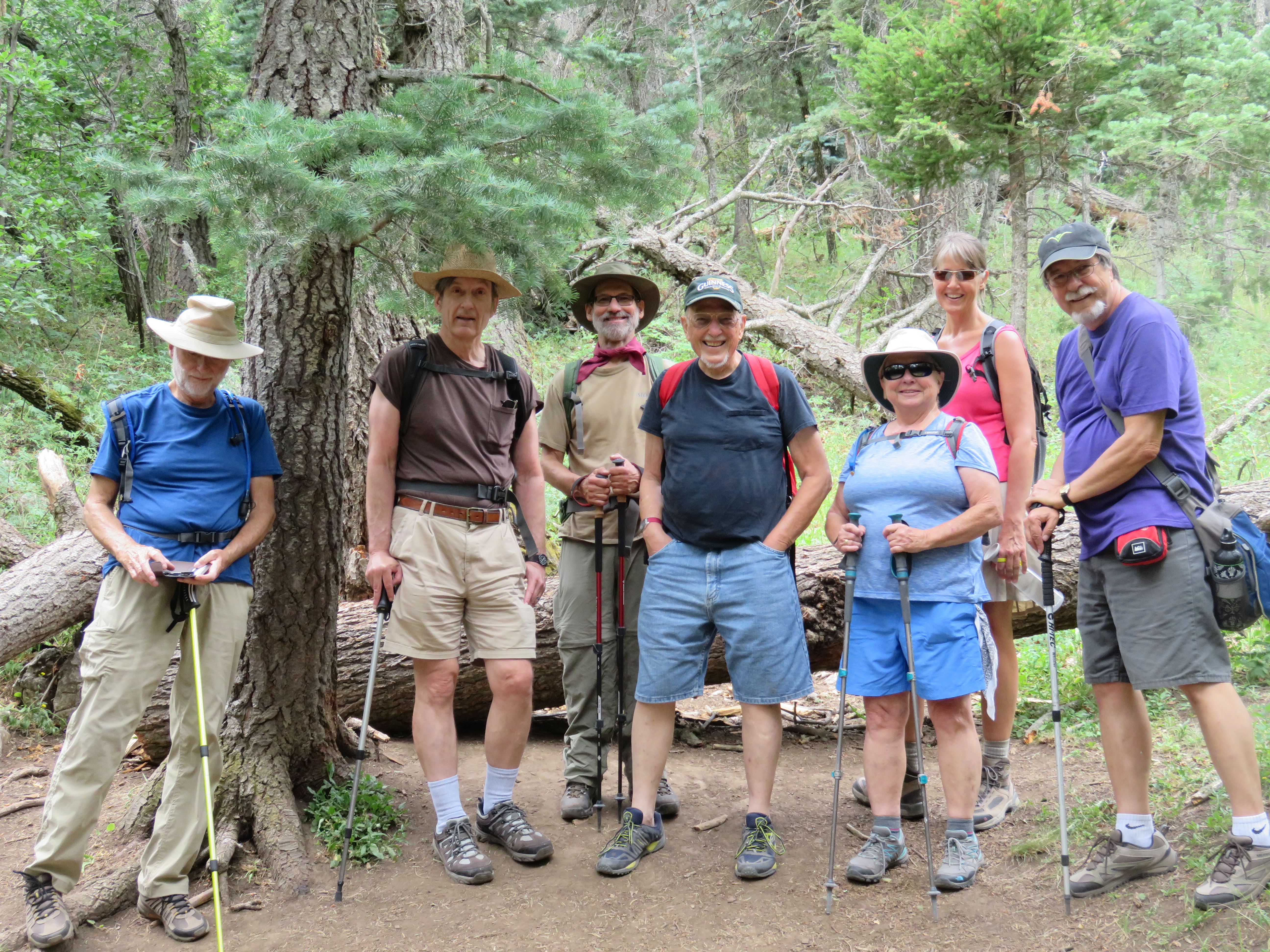 Great day for a hike. The weather was great for the ascent and we found a wonderful place to have lunch at the crest. This hike offers an easy ascent even thought the elevation gain is about 1000 feet (starting at 8500 feet). As you can see we were seven in number – Scott Lake (Leader) Ken Callahan, Bob Liebman, Brian Hill, Theresa Watson, John Kwait and Camilla Haneberg.