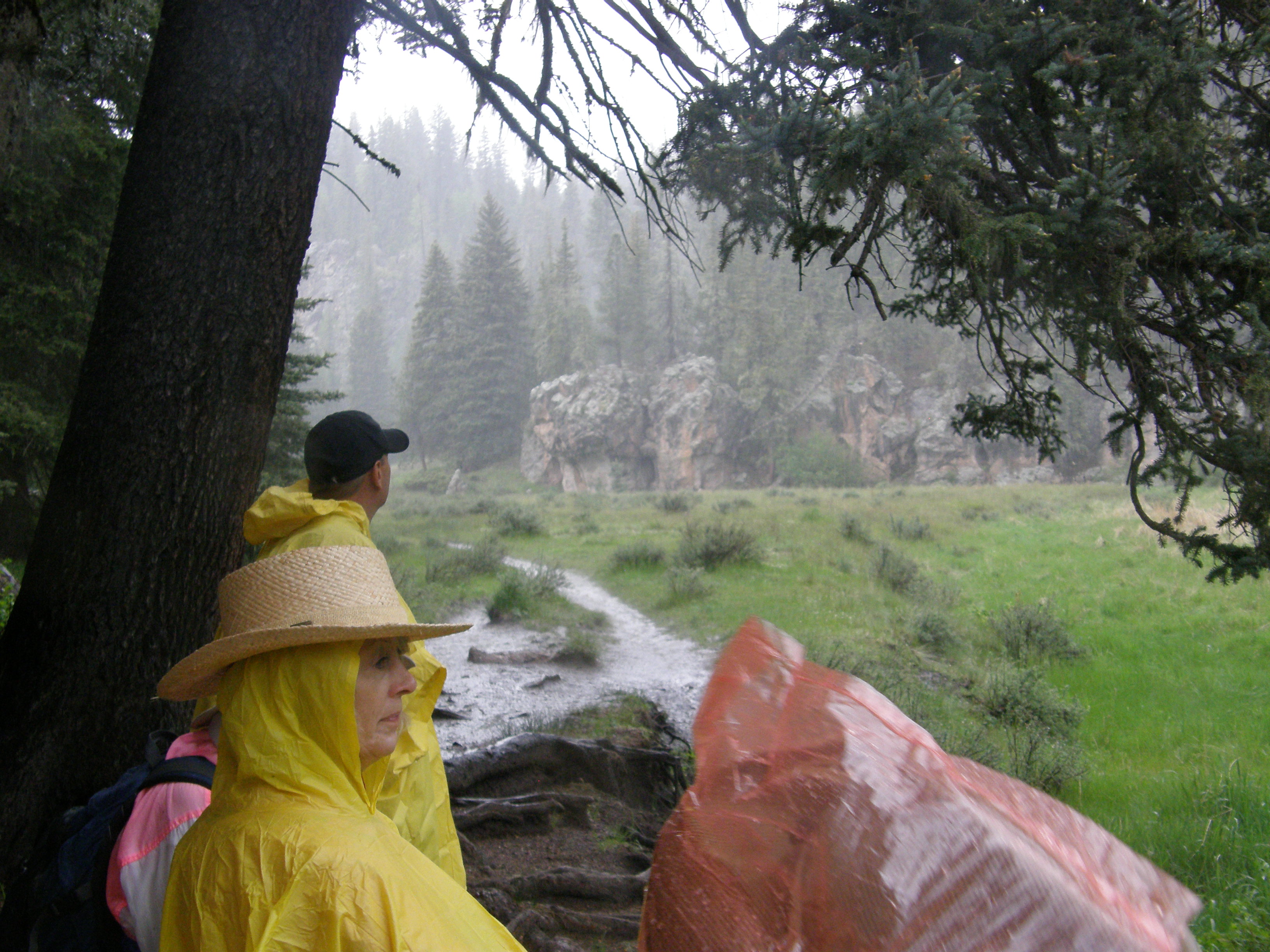 On the drive to the Las Conchas Trailhead on Sat, June 13 there was a lightening and thunder storm that seemed to follow us to the canyon along the East Fork of the Jemez River. We went on to the trail for a short distance but then we had to take shelter beneath a rock wall as the lightening and thunder were close and it was raining hard. We were a group of 6: Pam Bliss, her daughter Caroline, Diana & Bob Hayes, Manuel Lopez and Kathleen Rhoad.