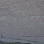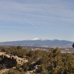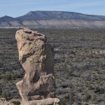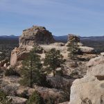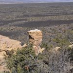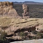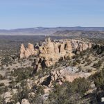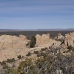 Actual Hike The hike starts at the parking spot. Just west of parking are good views of the bluffs, the El Malpais lava flow, and Gallo Mountain on the west side of the flow. Beyond are the Zuni Mountains. Start the hike by going north along the cliff top. Mount Taylor will be clearly visible to the north. This portion of the hike is about 1.3 miles, with many sandstone formations along the way. On reaching a downed barbed wire fence there is a drop off into the EASY WAY, the easy way to the bottom below the cliffs. Since this description is for a counterclockwise hike the hike continues on top of the ridge. There will be ups and downs as the route continues north. At 2.6 miles from the start there will be a rocky prominence to the west. Near the edge is the top of one of the larger arches in the area. To shorten the hike there is a steep way down is just north of this arch opening. Traverse back and forth to make the descent easier. Otherwise continue north along the top and find a way down to the floor. Do not go further than the [END] (2.3 mi) since the way will be pinched down by the lava flow. Once down turn back south and find a large rock surface with [INSCRIPTIONS] (2.8 mi) on it. This is a good stop for lunch if shade is desired. Then go back east and go north through a notch, passing the “foot”. It will be easier to see it as a foot after passing through the notch and looking back north. Look for the arch above at this point. After about 0.2 miles is the entrance to [HIDDEN VALLEY] (3.1 mi). It is possible to go up this notch to the top of one of the other arches, but continuing north would be difficult. Return to the entrance after going as far as desired. Continue along the base of the cliffs and to the [EASY WAY] (3.7 mi). If this is missed, there will not be another easy way further south. Once back on top, retrace the route to parking.