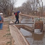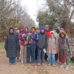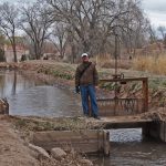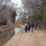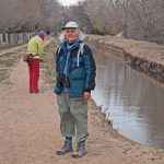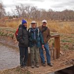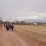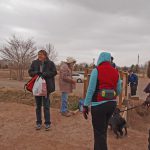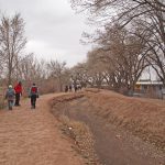 Thirteen of us and four dogs braved the cold weather with a light snow flurry about 9 to walk around the Los Poblanos Fields and along the acequia west of Rio Grand Blvd.  We walked to behind Los Poblanos Inn and Cultural Center past beautiful homes.  The day warmed up and all were in festive spirits.  Thanks to Neal MacDonald for the photos.