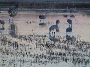 After lunch Maggie, Bud, and Tom split off to explore part of the refuge to the east of I-25. The remaining six hikers went down to Bosque del Apache, where we discovered that not that many cranes are there yet, and those that are there have enough food in the refuge so far, so they don’t bother to fly out and then fly back in. However, we were able to see a spectacular fly-in by the snow geese. They turned a green field vivid white.