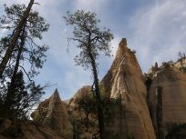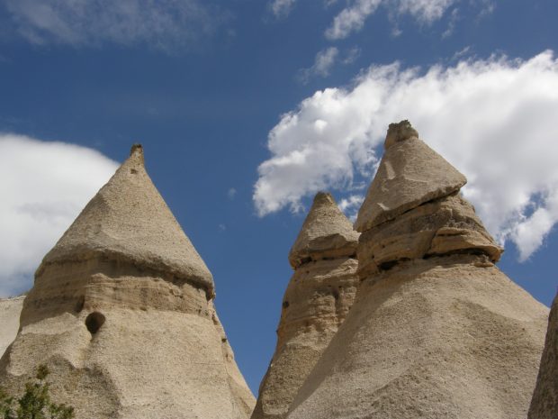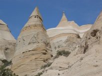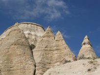 Kasha-Katuwe means white cliffs in traditional Keresan language of the Cochiti Pueblo. The elevation ranges from 5,570 feet to 6,760 feet above sea level. According to a BLM trail guide: “The cone-shaped tent rock formations are the products of volcanic eruptions that occurred 6 to 7 million years ago and left pumice, ash and tuff deposits over 1,000 feet thick.” The complex geological landscape is spectacular with distant views of mesas and Mt Baldy near Santa Fe. Now the road to Tent Rocks passes the base of Cochiti Dam, the major feature for flood control north of Albuquerque on the Rio Grande River. Construction began in 1965. Impoundment of water in Cochiti Lake began in 1973. http://en.wikipedia.org/wiki/Cochiti_Dam More informatin is at http://www.pueblodecochiti.org/recreation.html
